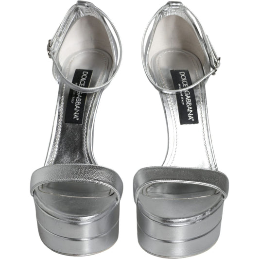 Dolce & Gabbana Metallic Silver Leather Keira Platform Sandals Shoes