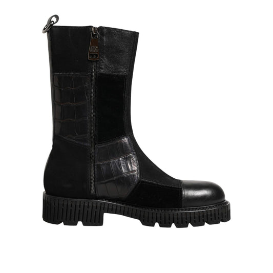 Dolce & Gabbana Black Patchwork Leather Mid Calf Boot Shoes